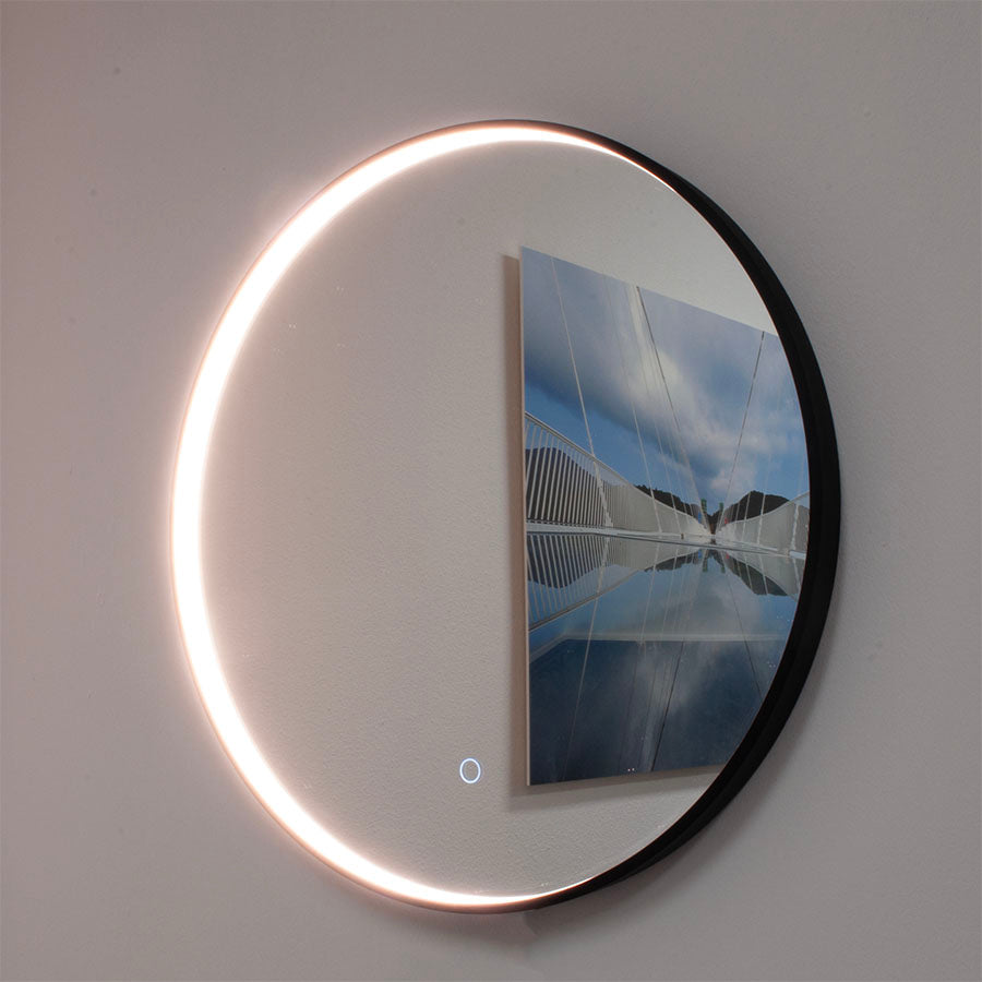 Ronde spiegel met zwart frame, met direct LED-verlichting en verwarming, 600mm.